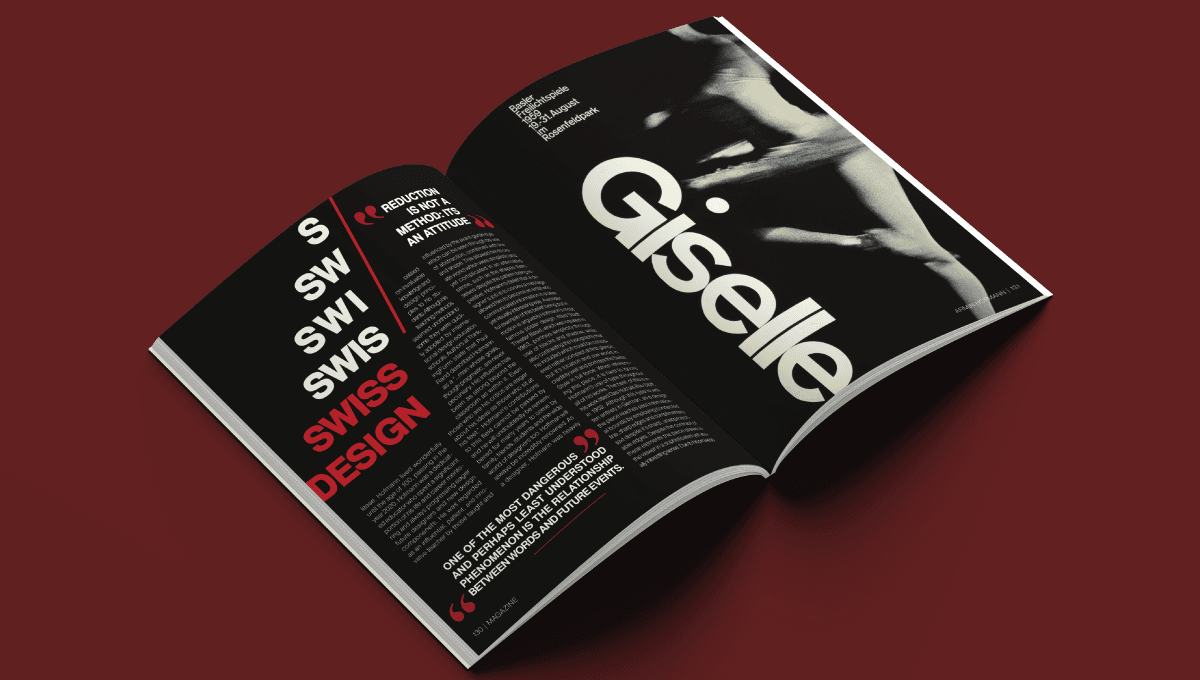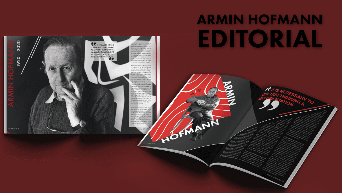 An editorial magazine that details the life and work of Armin Hofmann, a renowned Swiss designer. Each of the four spreads is designed with inspiration from Hofmann’s works. The use of typography flows with the visual elements to create a dynamic layout which interacts with the entirety of each spread while allowing ample negative space.