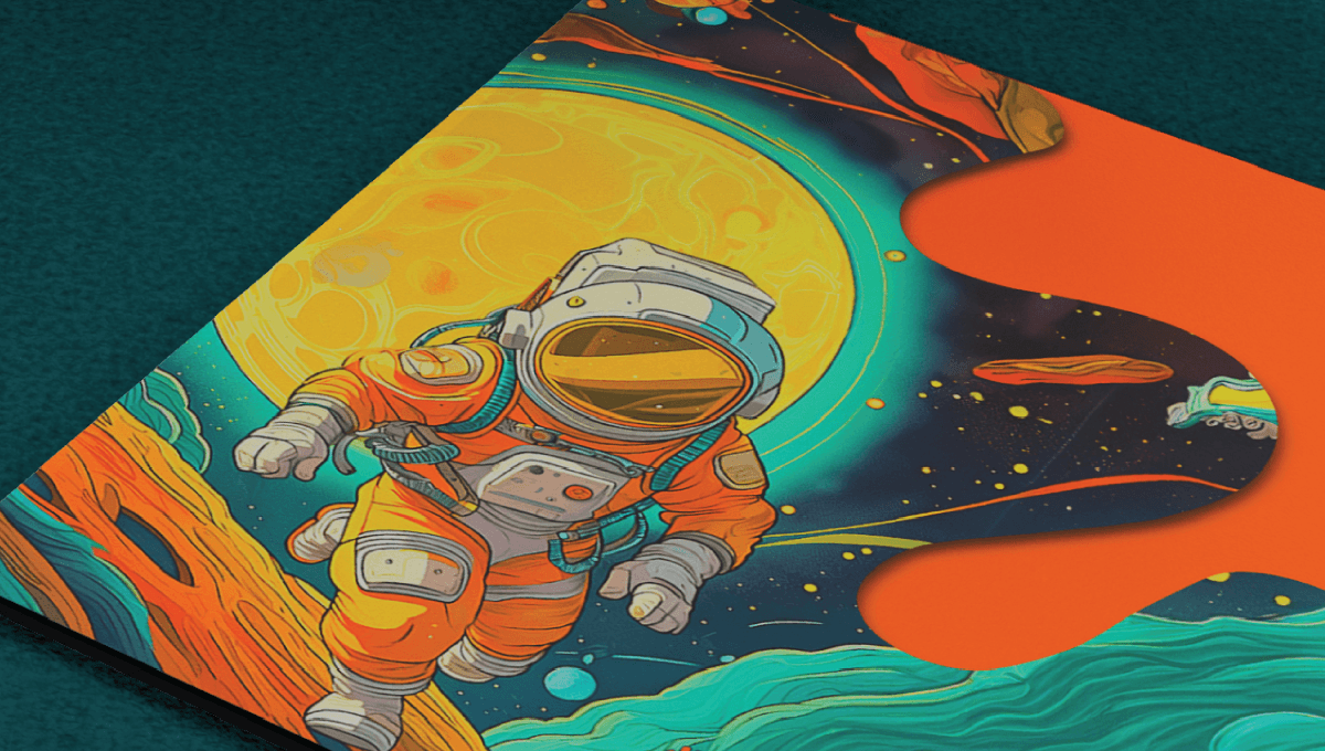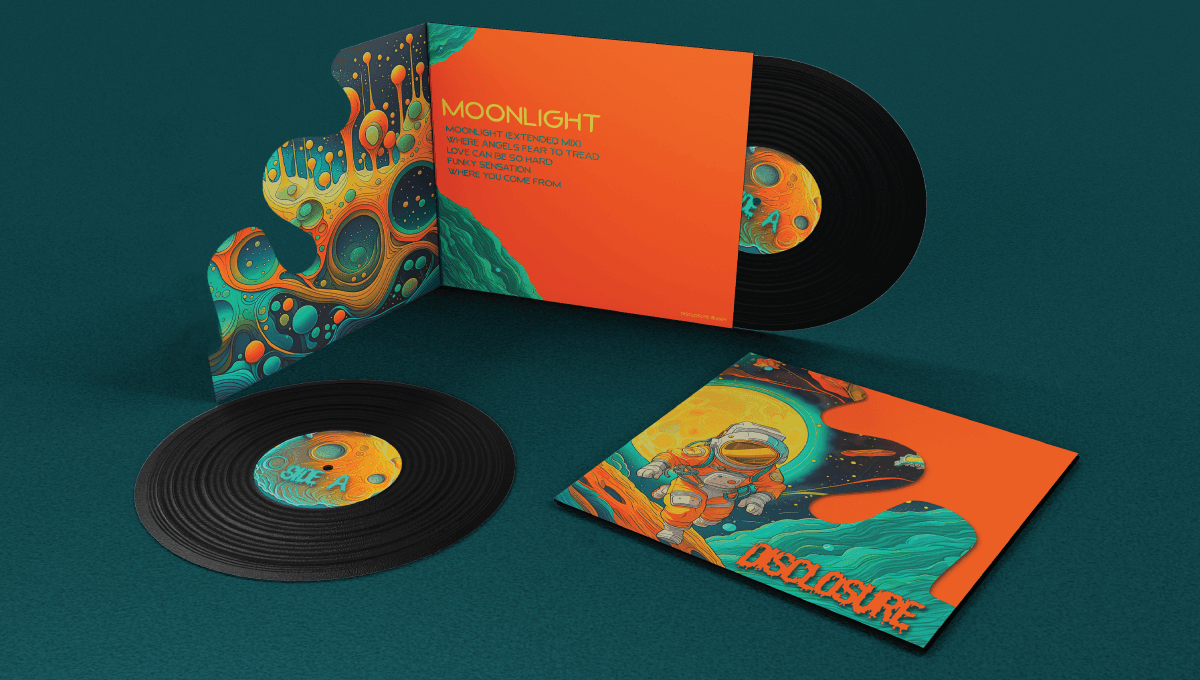 A long play record redesign for the album ‘Moonlight’ by the band disclosure. The design uses strong themes of outer space, bright colors and astronauts. Cutouts are used in the design as an element of visual interest and create added value to the product. Some AI was used in the production of the album’s imagery.