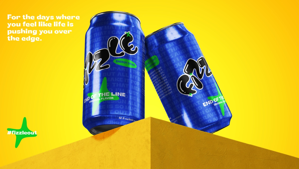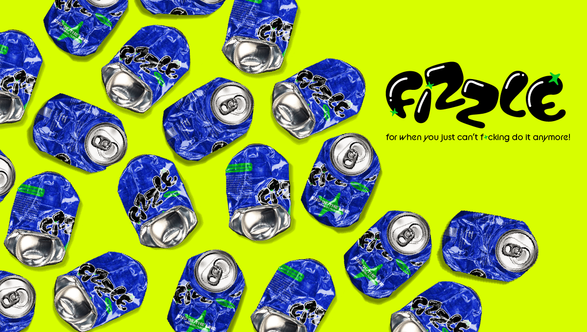 A cheeky energy drink that is marketed towards individuals experiencing severe burnout. A cheeky energy drink that is marketed towards individuals experiencing severe burnout. Inspired by the feeling of being overwhelmed but unable to do anything about it, bright colors scream in your face as the incoherent ramblings of a burnt-out creative fade into the back, adding texture to the can’s design. The copy on the can is vulgar and sarcastic as a way to make a connection with the customer, positioning the drink as a relatable solution to fizzling out.