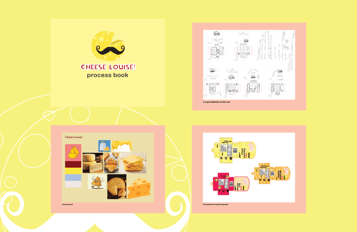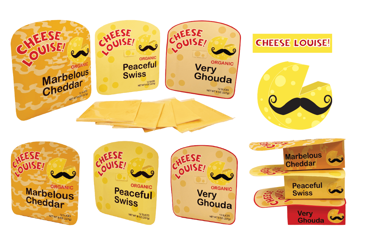 This is a comedic cheese brand package and design system that consists of three different types of cheese, marble cheddar, swiss, and gouda, with custom graphics, and comedic names that are appropriate for each cheese. The logo for this brand is a wheel of cheese with a mustache in the center of it, inspired by a time when mustaches were comedic. One of the most vital features of this package structure design is the two slits that serve as a secure place for the two scored flaps to hold the package closed.