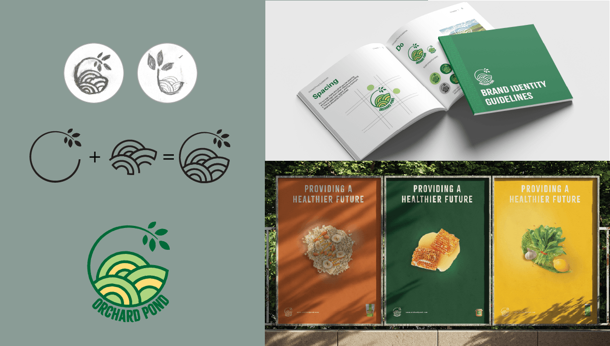 A logo redesigned using the gestalt principle of symmetry for an organic farm in Tallahassee, Florida. Orchard Pond produces granola, pesto sauce, and honey. The logo is intended to evoke natural and fresh. The green palette and simple design are inspired by the trees and hills at Orchard Pond.