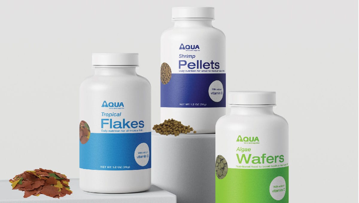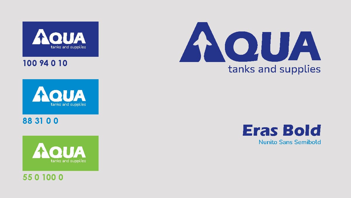 Aqua sells supply for aquarium owners. The counter form of the letter “A” is created by a fish silhouette. The fish is not enclosed entirely by the “A”; to indicate the freedom the fish will feel in a well-maintained tank. The letterforms have sharp corners and all caps to form a rectangle much like a fish tank.  The colors represent the variety of aquatic life that can be cared for with Aqua products.