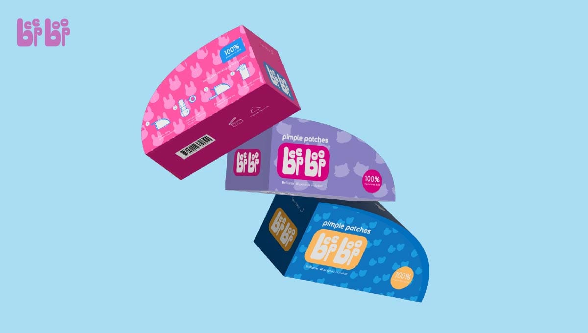 Beep Boop is a pimple patch brand that targets young women. The patches have cute animal shapes to create an interesting experience for consumers. Normally pimple patches are sold with lots of plastic packaging. The packaging for Beep Boop’s patches aims to be environmentally friendly by eliminating plastic. This is achieved by creating a wax paper tape roll that dispenses and protects the patches. The roller is portable and refillable to encourage consumers to reuse the packaging. The playful logo reflects the name and bright color choices allow the package to be engaging and stand out on the shelf in comparison to other skincare brands that tend to use a minimal style.