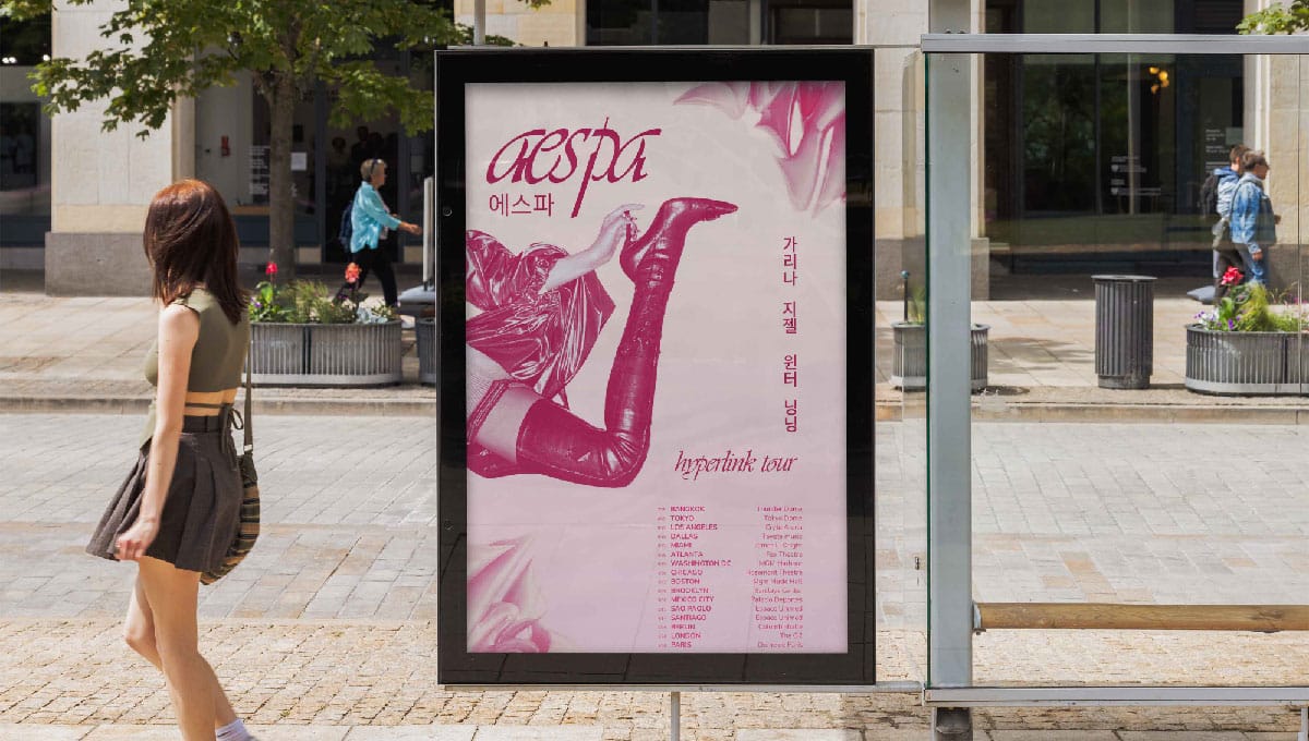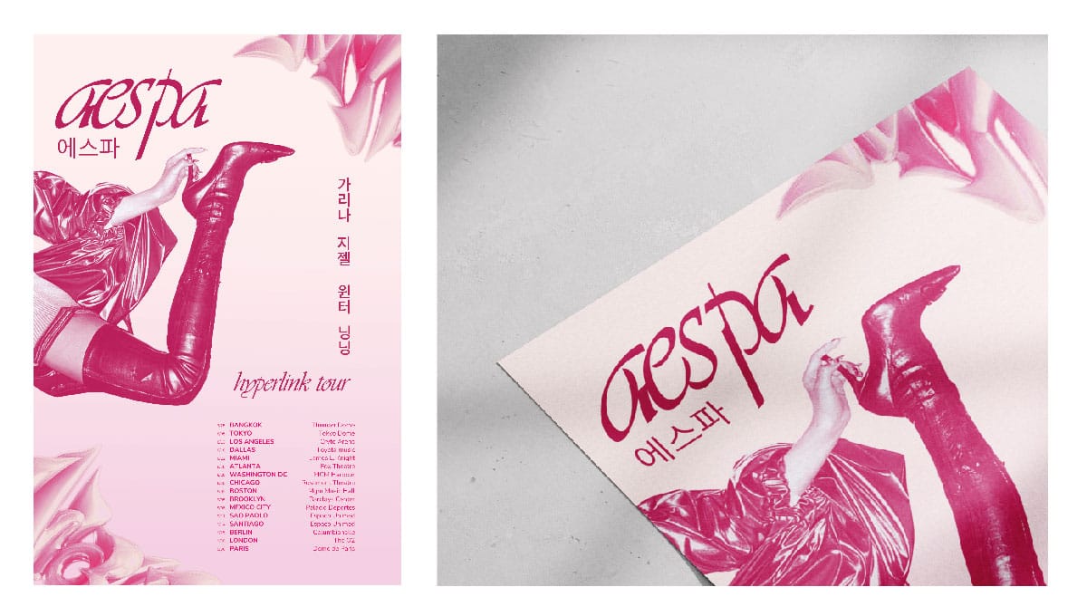 This poster celebrates Aespa’s 2023 Hyperlink World Tour. To emphasize the femininity and strength of this group, this poster incorporates soft and deep pinks. There is also an emphasis on geometric and organic symbols and patterns. The Korean letters on the poster are hand drawn and designed to match the typeface chosen for the English typography.