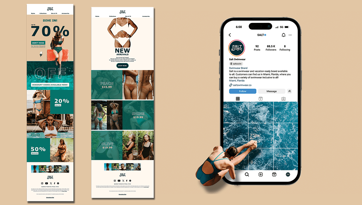 Email Marketing for the swimwear brand Salt. Each of the email’s focus on a specific aspect of the brands marketing, the first encourages email list members to follow the brand’s Instagram page, the second notifies of discounts and special codes, the last focuses on new swimsuits featured and their prices. The color palette is solely that of the brand with colors and photos utilized to guide viewers through each email.