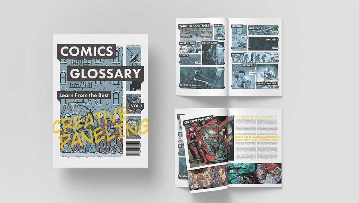 A magazine that catalogs strategies and tactics used by professionals in the comic book industry. The cover system uses a grid that allows for each issue to have a unique color palette with varying panels featuring a variety of comic books. The main color palette of the magazine is neutral black & white. Each magazine extends the cover’s color palette to the table of contents. Each of the article spreads demonstrates a unique comic strategy in a layout on a common grid. The focal points are the artwork examples and headlines.